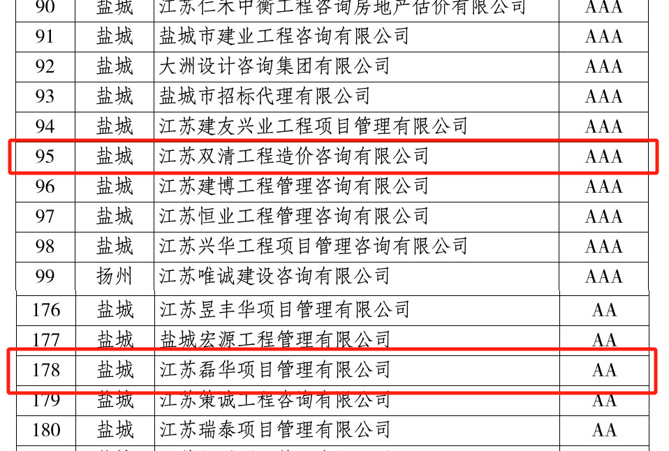 江蘇磊華項(xiàng)目管理有限公司獲得省AA級招標(biāo)代理信用評價(jià)、江蘇雙清工程造價(jià)咨詢有限公司獲得省AAA級招標(biāo)代理信用評價(jià)